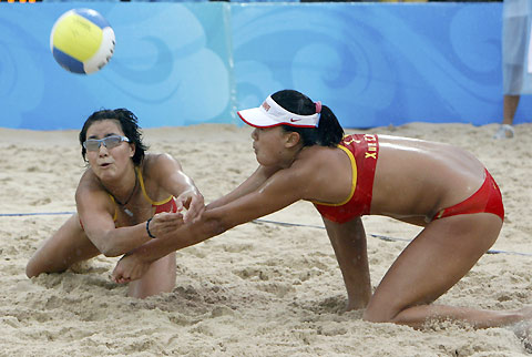 Zhang Xi (L) and Chen Xue of China compete in their women's beach volleyball bronze medal match against Talita Rocha and Renata Ribeiro of Brazil at the Beijing 2008 Olympic Games August 21, 2008. [Agencies]