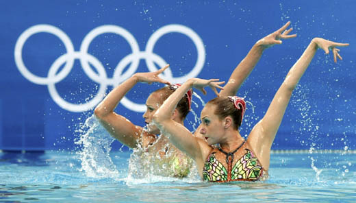 Christina Jones and Andrea Nott of the U.S. perform in the synchronised swimming duet free routine final at the Beijing 2008 Olympic Games August 20, 2008. [Agencies]