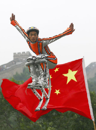 A student from Tagou Martial Arts School from Henan province jumps with a pair of spring-loaded stilts during a photo opportunity on the Badaling section of the Great Wall on the outskirts of Beijing, August 20, 2008. Some 199 students from the school will perform during the closing ceremony of Beijing 2008 Olympic Games and have been training on the outskirts of Beijing for more than half a year, local media reported. [Agencies]