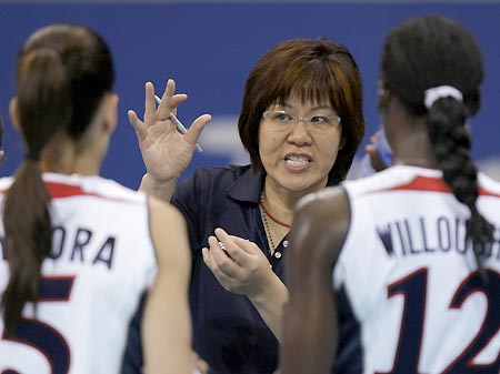 US head coach Lang Ping talks to her players Stacy Sykora (L) and Kim Willoughby in this August 17, 2008 file photo. [Agencies]