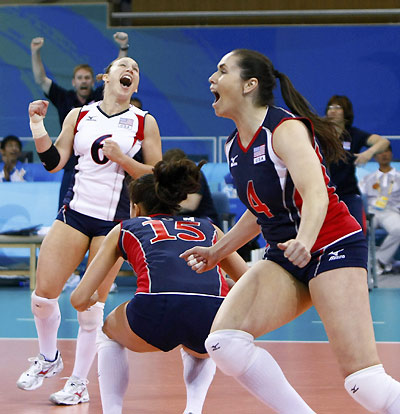 Players of the US celebrate after they beat Cuba in their women's semi-final volleyball match at the Beijing 2008 Olympic Games, August 21, 2008. [Agencies]