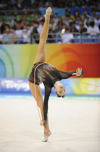 Ukraine's Ganna Bessonova competes in the individual all-around qualification of the rhythmic gymnastics at the Beijing 2008 Olympic Games in Beijing on August 21, 2008.[Agencies]