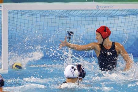 Elizabeth Armstrong of the U.S. (R) lets in a goal during their women's water polo gold medal match against the Netherlands at the Beijing 2008 Olympic Games August 21, 2008. [Agencies]