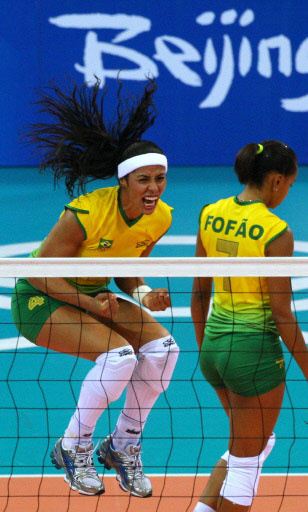 Brazil's players Paula Pequeno (L) and Helia Souza celebrate a point against China during the women's volleyball semifinal in the 2008 Beijing Olympic Games in Beijing on August 21, 2008.[Agencies]