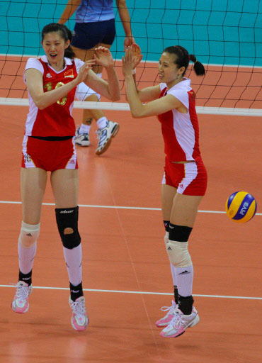 China's Xue Ming (L) celebrates a point with team mate Zhou Suhong during the match against Brazil in the women's volleyball semifinal in the 2008 Beijing Olympic Games in Beijing on August 21, 2008.[Agencies]
