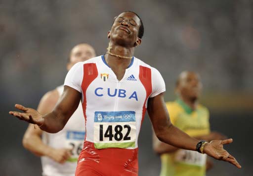 Cuba's Dayron Robles reacts after winning the men's 110m hurdles final at the "Bird's Nest" National Stadium during the 2008 Beijing Olympic Games on August 21, 2008. Robles won the 110m hurdles Olympic title within 12.93 seconds. The 21-year-old beat home two US athletes, David Payne (13.17sec) and David Oliver (13.18sec). [Agencies]