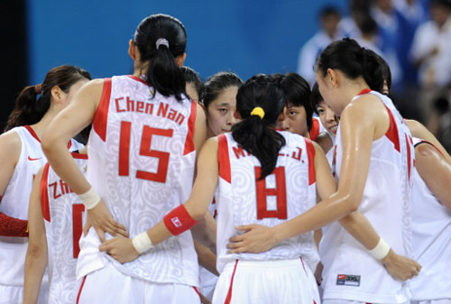 Chinese players cheer each other after their women's semi-final basketball match China against Australia of the Beijing 2008 Olympic Games on August 21, 2008 at the Olympic Basketball Arena in Beijing. Australia won 90-56.[Agencies]