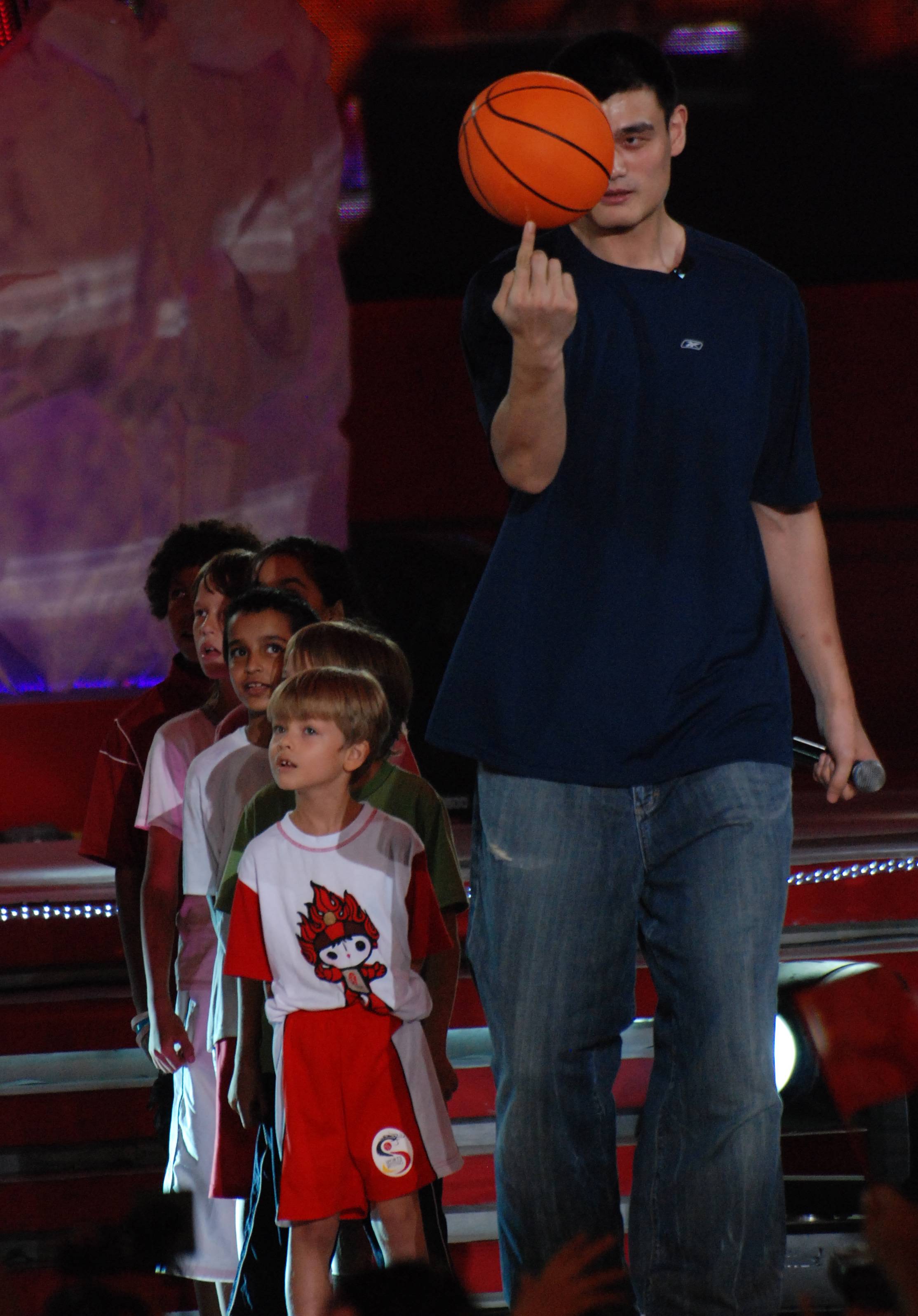 NBA star Yao Ming from China plays a basketball game with kids during a promotion show for Olympics in Beijing on August 21, 2008. [Xinhua]