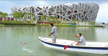 Workers clean up the artificial lake surrounding the Bird's Nest. [China Daily]