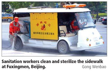 The company dispatched 187 pieces of sanitation equipment of various types, including an advanced multi-functional street-cleaning vehicle imported from Sweden, to the Olympic areas, Wang said.