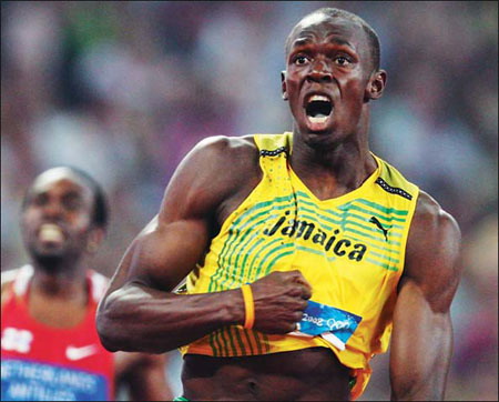 Usain Bolt of Jamaica celebrates after winning the men's 200m final of the athletics competition in the National Stadium at the Beijing 2008 Olympic Games August 20, 2008. Bolt set a new world record with a timing of 19.30 seconds. [Agencies]