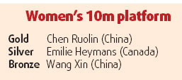 "I didn't notice the score before my fifth dive, but I realized that my score might be lower than Emilie, so I was a little bit nervous," said the 15-year-old Chen. "When I performed the last dive well, I was very relaxed."