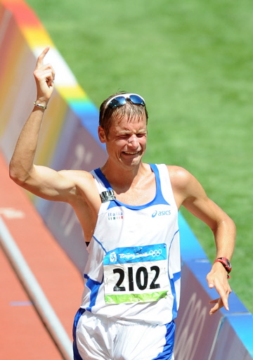 Italy's Alex Schwazer crosses the finish line and won the men's 50km walk ahead Australia's Jared Tallent and Russia's Denis Nizhegorodov at the National stadium as part of the 2008 Beijing Olympic Games on August 22, 2008.[Agencies]