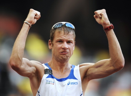 Italy's Alex Schwazer celebrates winning the men's 50km walk at the "Bird's Nest" National Stadium during the 2008 Beijing Olympic Games on August 22, 2008.[Agencies]