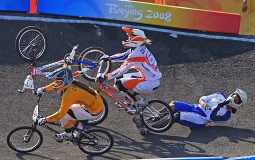 Britain's Shanaze Reade (R) falls while Nicole Callisto of Australia (L) and Lieke Klaus of the Netherlands (C) race past during the semi-final heat in the women's BMX finals at the 2008 Beijing Olympic Games at the Laoshan BMX venue on August 22, 2008. [Agencies]