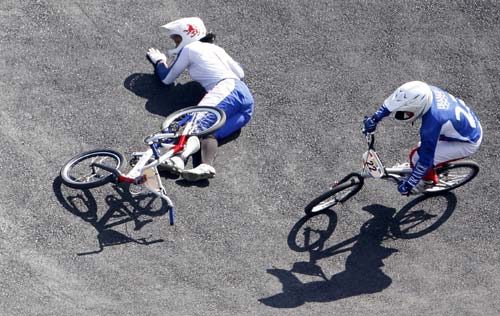 Laetitia le Corguille of France overtakes Shanaze Reade (L) of Britain after Reade falls during the women's final run for the BMX cycling competition at the Beijing 2008 Olympic Games August 22, 2008. [Agencies]