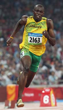 Jamaica's Usain Bolt runs in the men's 200m final at the National Stadium as part of the 2008 Beijing Olympic Games on August 20, 2008. Bolt broke the men's 200 metres world record timing 19.30 seconds as he clinched the Olympic Games gold to add to his 100m crown. The Jamaican won ahead of Churandy Martina of the Dutch Antilles and Shawn Crawford of the US. [Agencies]