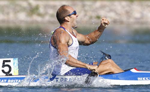 Tim Brabants of Britain celebrates winning his men's kayak single K1 1000m final of the Beijing 2008 Olympic Games at Shunyi Olympic Rowing-Canoeing Park north of Beijing, August 22, 2008. [Agencies]