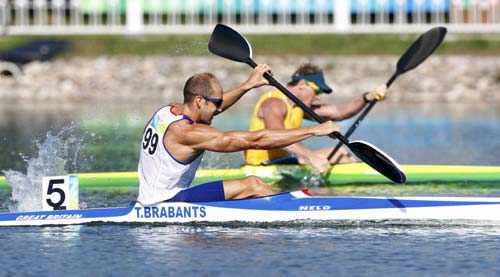 Tim Brabants of Britain (front) paddle past Ken Wallace of Australia to win their men's kayak single K1 1000m final of the Beijing 2008 Olympic Games at Shunyi Olympic Rowing-Canoeing Park north of Beijing, August 22, 2008. [Agencies]