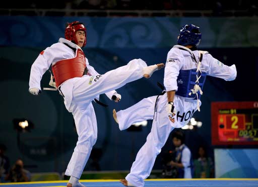 Zhu Guo (red) of China fights with Miguel Perrera Rodriguez of Honduras in the men's -80 kg taekwondo preliminary match during the 2008 Beijing Olympic Games in Beijing on August 22, 2008.