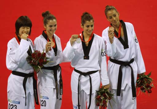 (L-R) gold medalist Lim Sujeong of South Korea, bronze medalist Martina Zubcic of Croatia, Silver medalist Azize Tanrikulu of Turkey and bronze medalist Diana Lopez of the US pose during the medal ceremony for the women's -57 kg taekwondo match during the 2008 Beijing Olympic Games in Beijing on August 21, 2008.[Agencies]