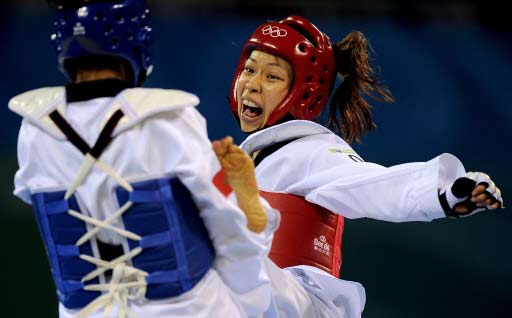 Yoriko Okamoto (red) of Japan fights with Mouna Benabderrassoul of Morocco in the women's -67 kg taekwondo preliminary match during the 2008 Beijing Olympic Games in Beijing on August 22, 2008.[Agencies]