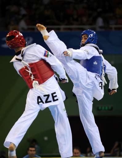 Abdulqader Hikmat A Sarhan (blue) of Qatar kicks Rashad Ahmadov of Azerbaijan in the men's -80 kg taekwondo preliminary match during the 2008 Beijing Olympic Games in Beijing on August 22, 2008.[Agencies]