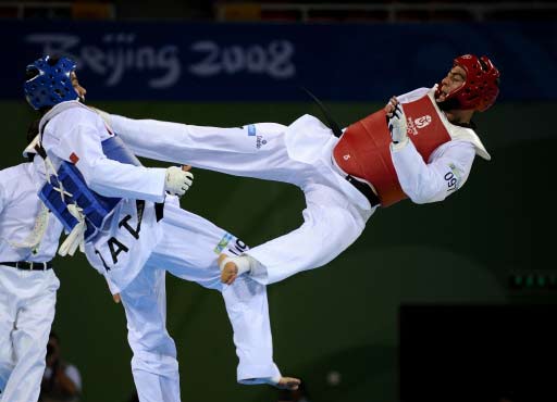 Rashad Ahmadov (red) of Azerbaijan lands a kick on Abdulqader Hikmat A Sarhan of Qatar in the men's -80 kg taekwondo preliminary match during the 2008 Beijing Olympic Games in Beijing on August 22, 2008.