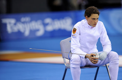 Lena Schoneborn of Germany rests during the fencing event of the women's modern pentathlon competition at the Beijing 2008 Olympic Games August 22, 2008.[Agencies]
