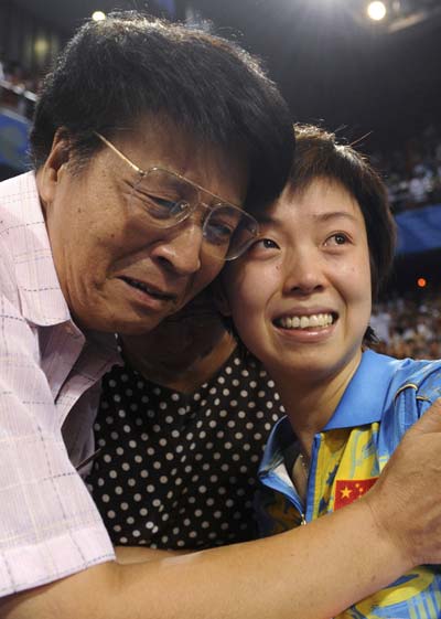 Zhang Yining of China celebrates with her father Zhang Qiyuan after winning her women's singles gold medal table tennis match against compatriot Wang Nan at the Beijing 2008 Olympic Games August 22, 2008. [Agencies]