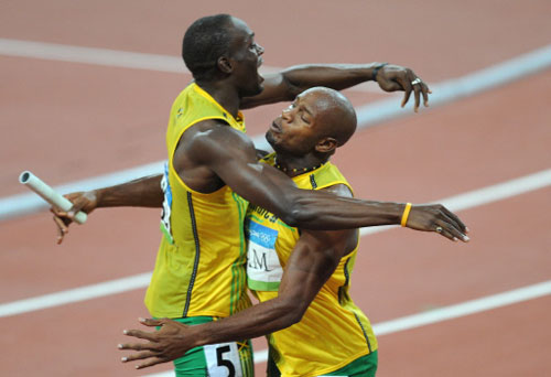 Jamaica's Usain Bolt (L) celebrates with teammate Asafa Powell after they won the men's 4x100m relay final at the National Stadium during the 2008 Beijing Olympic Games on August 22, 2008. Jamaica won the men's 4x100 metres Olympic title timing a new world record of 37.10 seconds. [Agencies]