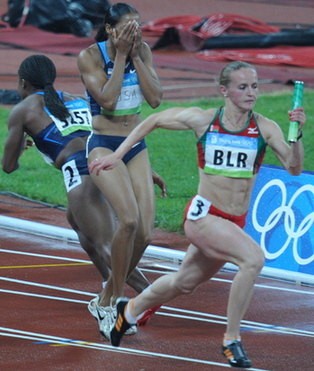 Torri Edwards of the US (C) reacts as teammate Lauryn Williams (L) runs for the baton as they compete against Belarus' Anna Bagdanovich (R) during the women's 4x100m Relay round 1 heat at the National stadium as part of the 2008 Beijing Olympic Games on August 21, 2008. [Agencies]