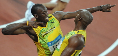 Jamaica's Usain Bolt (L) celebrates next to teammate Asafa Powell after they won the men's 4?00m Relay final at the National Stadium during the 2008 Beijing Olympic Games on August 22, 2008. [Agencies]