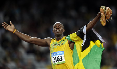 Usain Bolt of Jamaica celebrates winning the men's 100m final of the athletics competition in the National Stadium at the Beijing 2008 Olympic Games August 16, 2008.[Agencies]