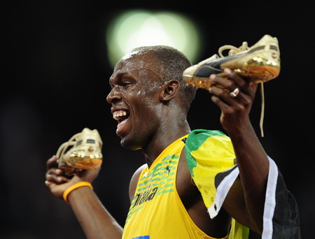 Usain Bolt of Jamaica celebrates winning the men's 100m final of the athletics competition in the National Stadium at the Beijing 2008 Olympic Games August 16, 2008.[Agencies]
