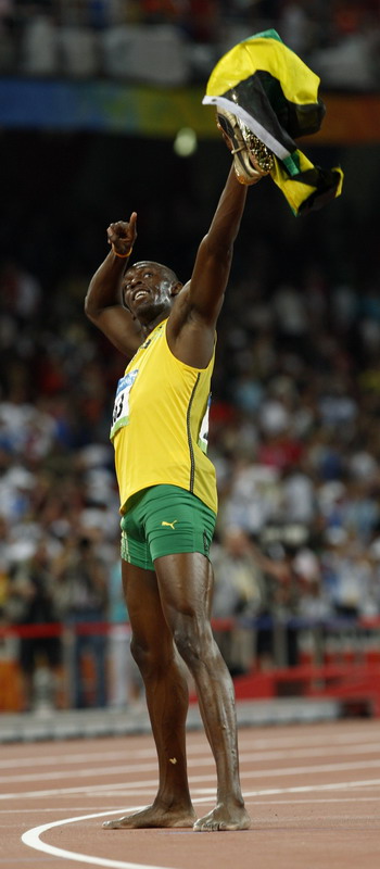 Usain Bolt of Jamaica gestures after winning the men's 100m final of the athletics competition in the National Stadium at the Beijing 2008 Olympic Games August 16, 2008.[Agencies]