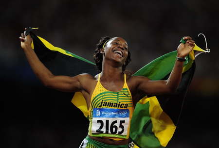 Shelly-Ann Fraser of Jamaica celebrates winning the women's 100m final of the athletics competition in the National Stadium at the Beijing 2008 Olympic Games August 17, 2008.[Agencies]