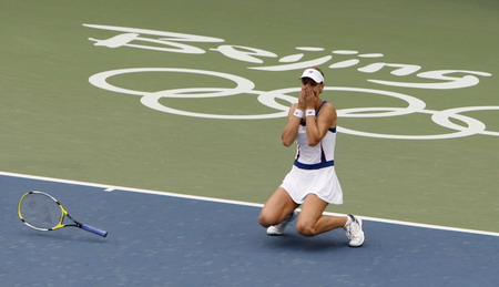 Elena Dementieva of Russia celebrates after winning her women's singles final tennis match against her compatriot Dinara Safina at the Beijing 2008 Olympic Games August 17, 2008.[Agencies]