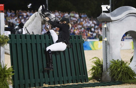 New Zealand's Katie McVean falls off Forest after he refused to jump a fence during the equestrian jumping individual first qualifier at the Beijing 2008 Olympic Games in Hong Kong August 15, 2008. [Agencies]