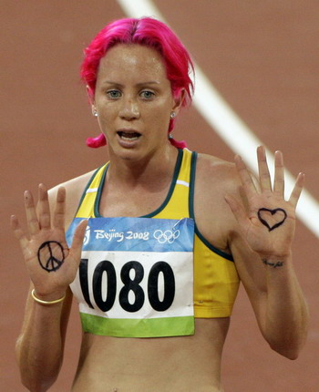 Victoria Mitchell of Australia gestures after competing in the women's 3000m steeplechase heat of the athletics competition in the National Stadium at the Beijing 2008 Olympic Games August 15, 2008. [Agencies]