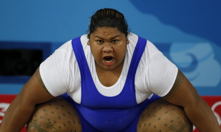 Ele Opeloge of Samoa competes in the women's +75kg Group A snatch weightlifting competition at the Beijing 2008 Olympic Games August 16, 2008. [Agencies]