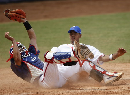 Catcher Yeh Chun-Chang (L) of Chinese Taipei reacts after tagging out Cuba's Hector Olivera after he tried to score from second base on a fielder's choice in the eighth inning during their men's preliminaries baseball game at the Beijing 2008 Olympic Games August 16, 2008. [Agencies]
