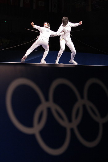 Ildiko Mincza-Nebald of Hungary (L) competes against Imke Duplitzer of Germany during their women's individual epee fencing competition at the Beijing 2008 Olympic Games, August 13, 2008. [Agencies]
