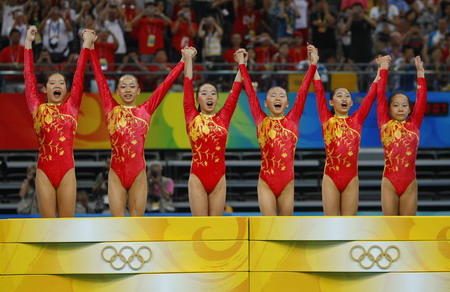 From L to R : Cheng Fei, Yang Yilin, Li Shanshan, He Kexin, Jiang Yuyuan and Deng Linlin of China celebrate as they arrive on the podium after winning the women's team artistic gymnastics gold medal at the Beijing 2008 Olympic Games August 13, 2008. [Agencies]