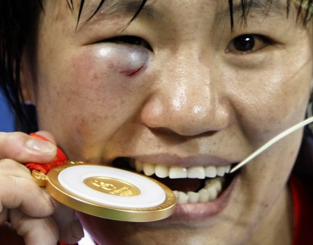Gold medallist Yang Xiuli of China bites her medal during the medal ceremony of the women's -78 kg judo event at the Beijing 2008 Olympic Games, August 14, 2008. [Agencies]