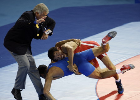 Kanatbek Begaliev of Krygyzstan (in red) and Armen Vardanyan of Ukraine crash into referee Lee Ronald Mackay during their men's 66kg Greco-Roman quarter-final wrestling match at the Beijing 2008 Olympic Games August 13, 2008. [Agencies]