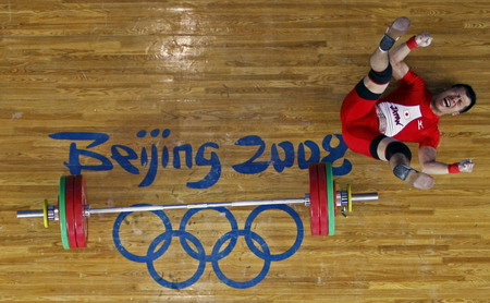 Masaharu Yamada of Japan celebrates after he lifted 153kg in the clean and jerk segment to lead the men's 56kg Group B weightlifting competition at the Beijing 2008 Olympic Games August 10, 2008. [Agencies]
