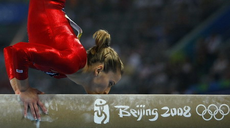 Alicia Sacramone of the U.S. competes in the women's qualification balance beam during the artistic gymnastics competition at the Beijing 2008 Olympic Games August 10, 2008. [Agencies]