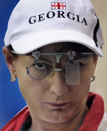 Nino Salukvadze of Georgia reacts during the women's 10m air pistol shooting competition at the Beijing 2008 Olympic Games August 10, 2008. [Agencies]