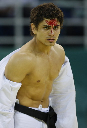 Ecuador's Roberto Ibanez bleeds as he competes with Canada's Sasha Mehmedovic in the mens' 66 kg preliminary judo match at the Beijing 2008 Olympic Games August 10, 2008. [Agencies]
